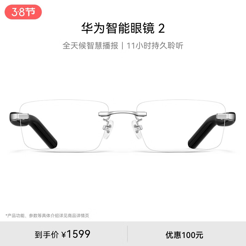 华为智能眼镜 2 无框光学镜 无线双耳立体声/通话隐私保护/通话降噪/语音控制/长续航/开放式耳机价格:1599.00元!