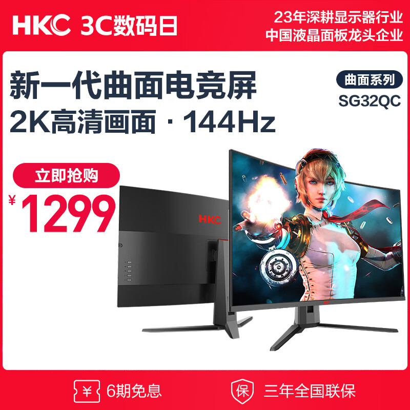 HKC 31.5英寸 高清2K144Hz专业电竞屏1500R曲面hdmi吃鸡游戏 不闪屏支持壁挂 液晶电脑显示器 SG32QC价格:1499.00元!