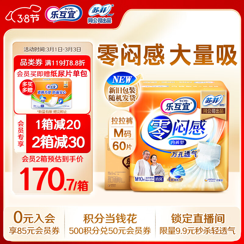 乐互宜零闷感成人拉拉裤老年人透气消臭内裤型尿不湿M码60片/箱价格:228.00元!