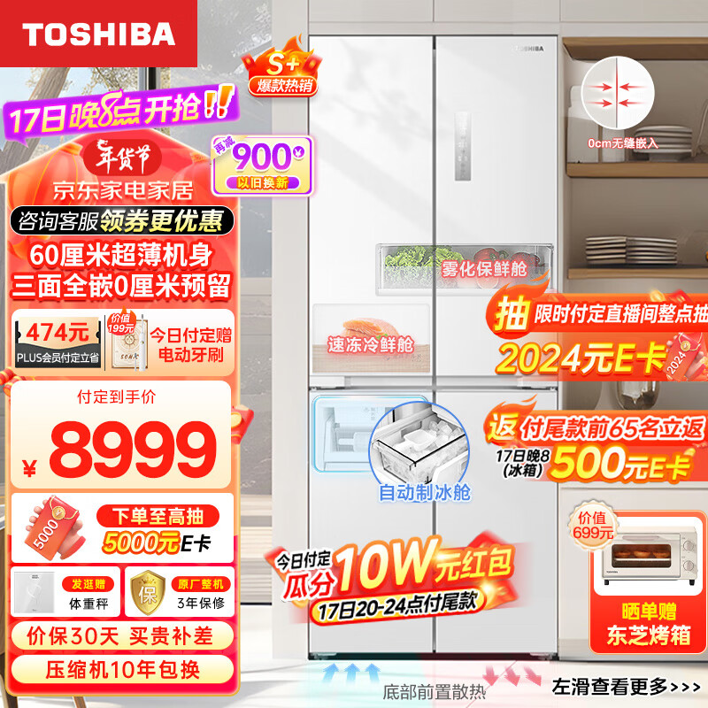 东芝(TOSHIBA)450白珍珠60厘米超薄零距离嵌入式十字对开门大容量家用电冰箱无霜变频GR-RF450WI-PM151荧纱白价格:9464.00元!