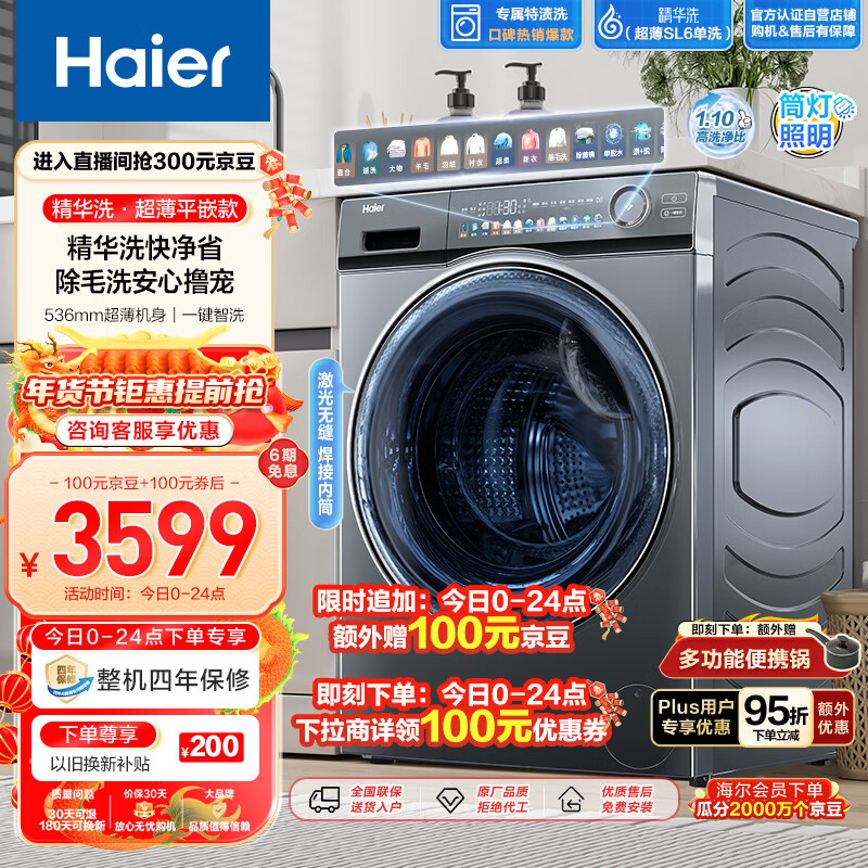 海尔(Haier)滚筒洗衣机全自动 精华洗SL6 10公斤大容量 大筒径高洁净 超薄平嵌 以旧换新 EG100MATESL6价格:3799.00元!