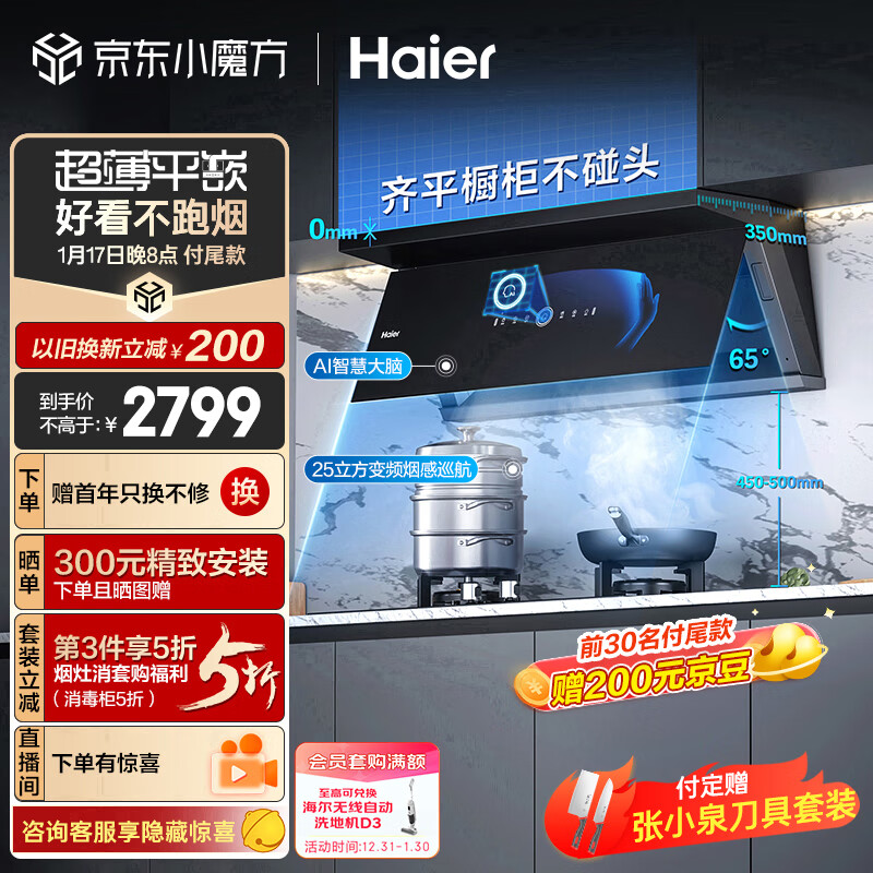 海尔(Haier)抽油烟机 超薄近吸 家用吸油烟机 25m3/min变频有效风 烟感巡航 顶侧双吸外观 厨房排烟机C21U1价格:2799.00元!