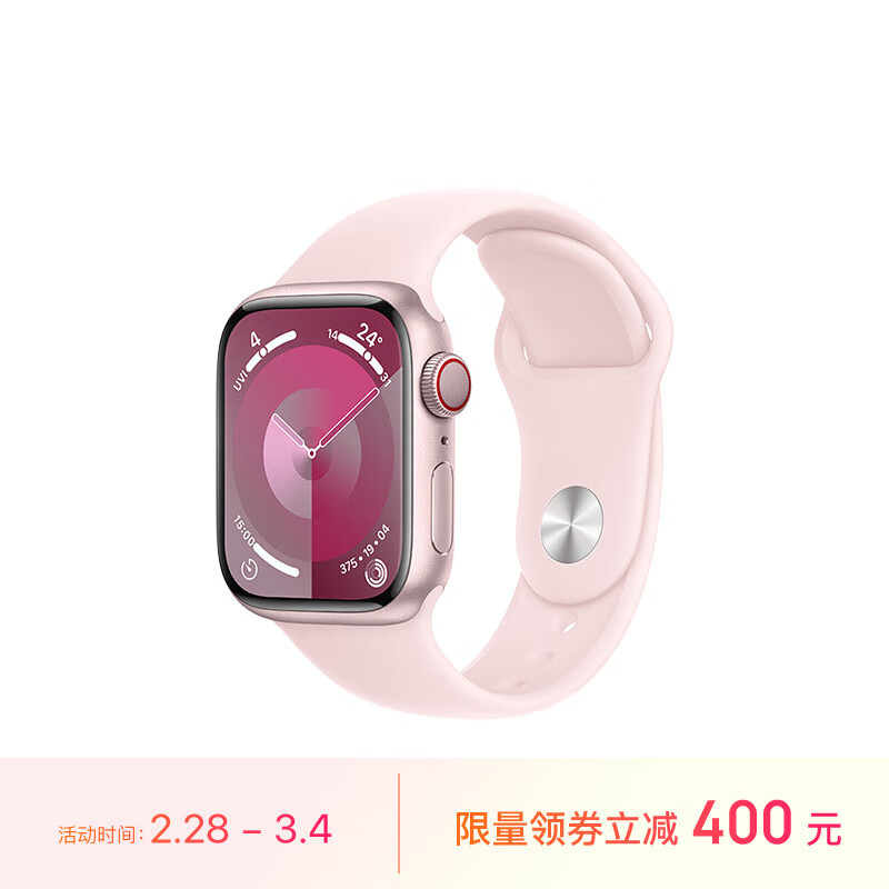 Apple/苹果 Watch Series 9 智能手表GPS+蜂窝款41毫米粉色铝金属表壳亮粉色运动型表带M/L MRJQ3CH/A价格:3799.00元!