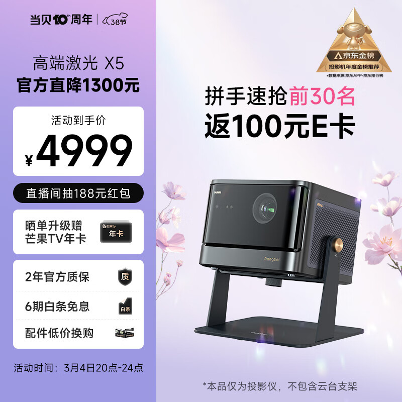 当贝 X5 激光投影仪家用 游戏投影机(ALPD影院激光无散斑 2450 CVIA流明 MT9679全新大师芯片4G+64G)价格:4999.00元!