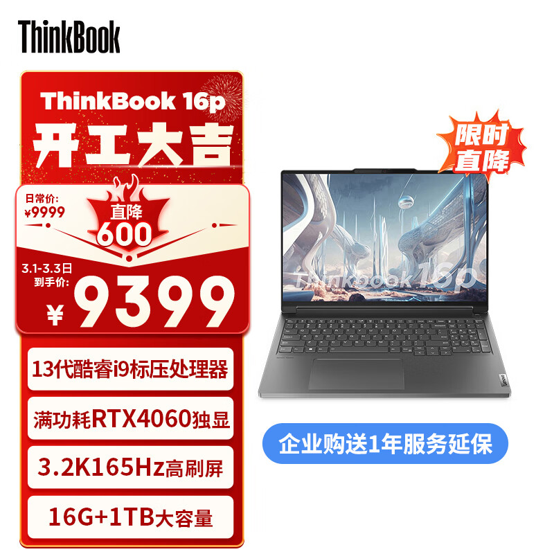 ThinkPad联想ThinkBook 16p 英特尔酷睿i9 16英寸轻薄游戏创作本13代i9-13900H 16G 1T RTX4060 3.2K 165Hz价格:9399.00元!