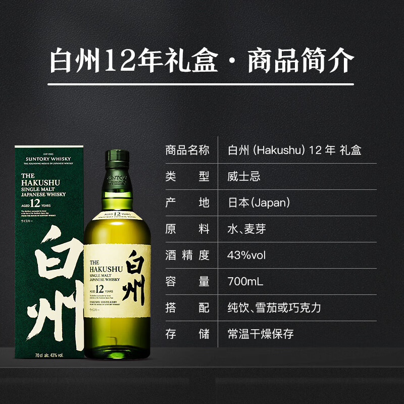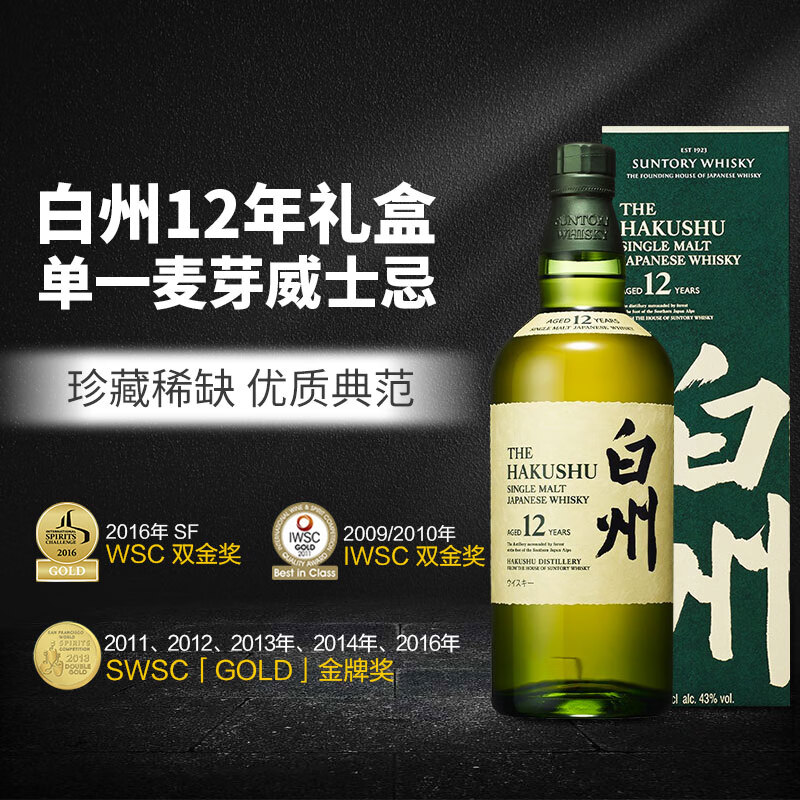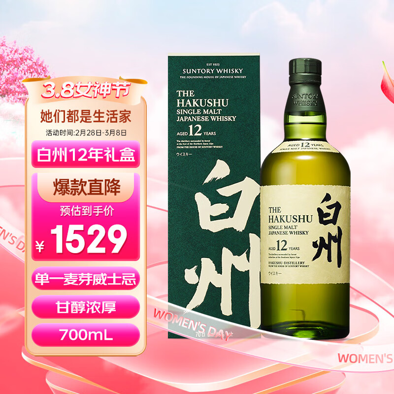 白州(Hakushu)12年 单一麦芽威士忌 700ml 三得利洋酒(礼盒款)价格:1529.00元!