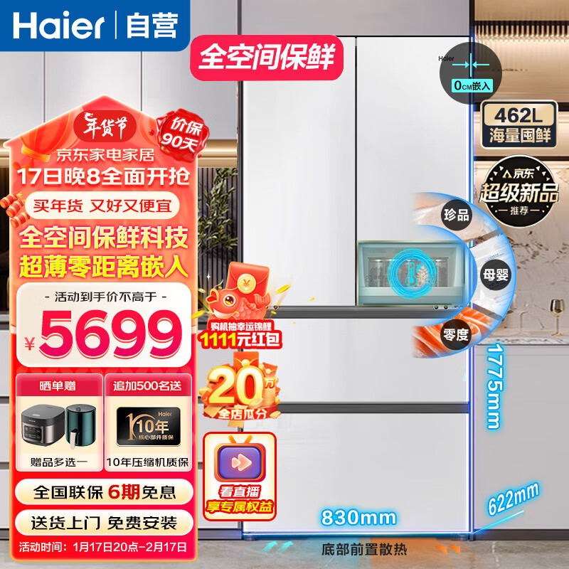 海尔白巧462L零距离自由嵌入多门四开门法式电冰箱家用白色一级能效超薄嵌入式底部散热 全空间保鲜价格:5699.00元!