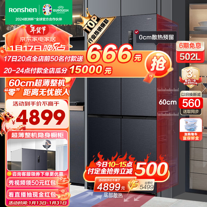 容声(Ronshen)【60cm平嵌】502L十字双开四开门多门超薄零距离嵌入式一级变频底部散热家用无霜超大容量冰箱 灰色 星空灰BCD-502WD1FPQ价格:5399.00元!