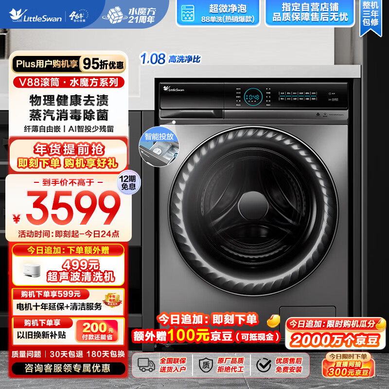 小天鹅(LittleSwan)滚筒洗衣机全自动 超微净泡水魔方 物理去渍 智能投放 超薄10公斤 TG100V88WMUIADY5价格:3599.00元!
