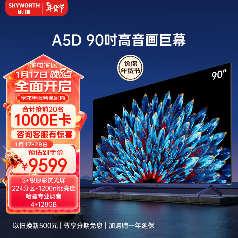 创维电视90A5D 90英寸电视机4+128G哈曼调音一级能效4K超薄护眼平板巨幕大屏游戏电视98 100价格:9999.00元!