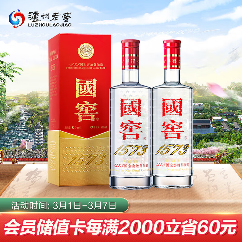 泸州老窖 国窖1573 浓香型 高度白酒 52度500ml*2 经典双瓶装 (宴请送礼)价格:2080.00元!