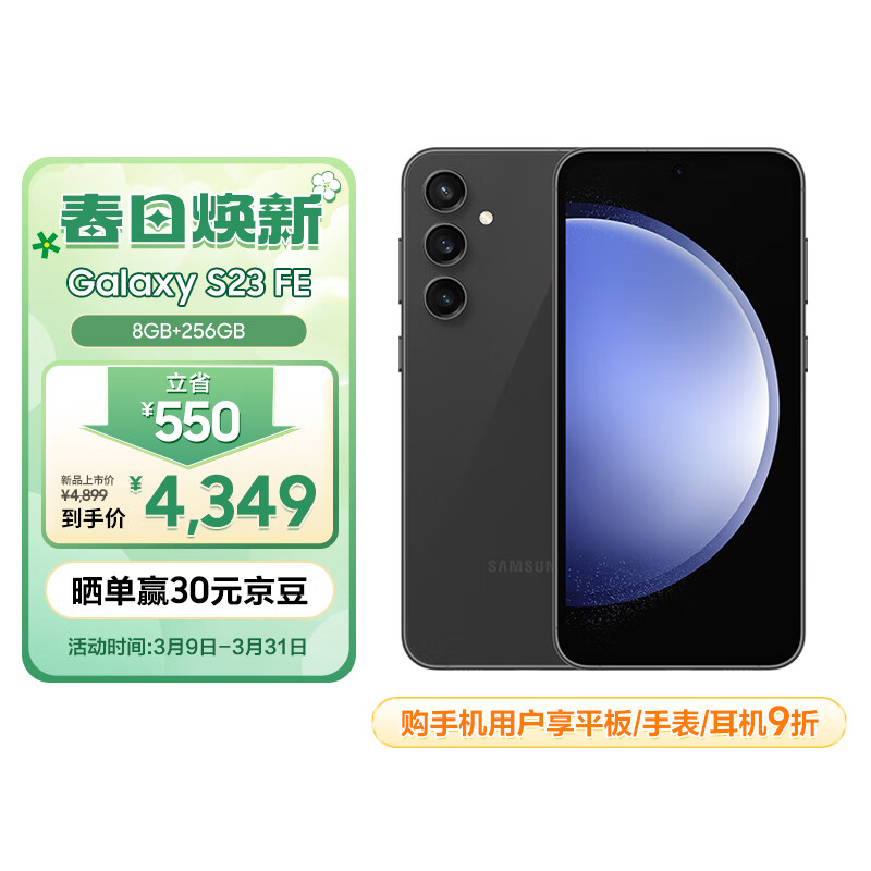 三星(SAMSUNG)Galaxy S23 FE 双光学防抖 5000万像素后置主摄 4500mAh大电池 5G手机 8GB+256GB 山岩灰价格:4349.00元!