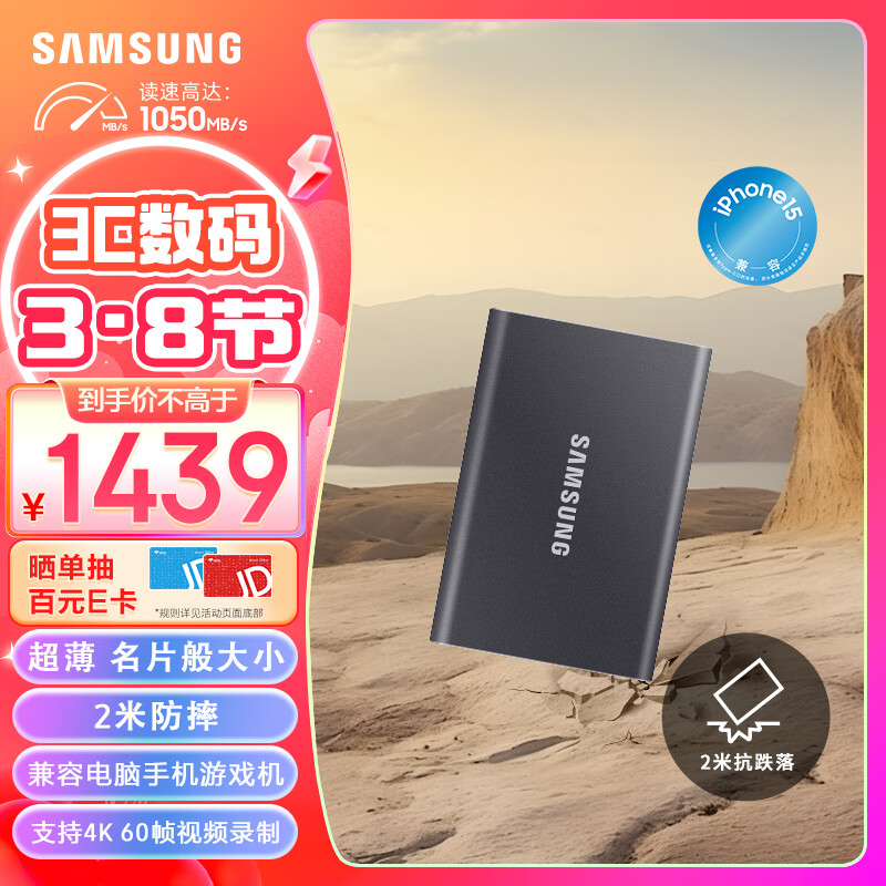 三星(SAMSUNG) 2TB Type-c USB 3.2 移动固态硬盘(PSSD) T7 灰色 NVMe传输速度1050MB/s 超薄时尚价格:1439.00元!