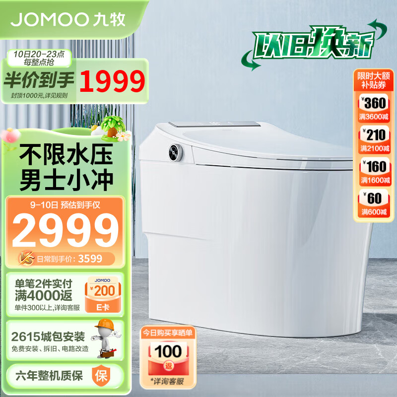 九牧(JOMOO)智能马桶一体机带水箱不限水压一级水效智能坐便器ZS660 400坑距价格:3499.00元!