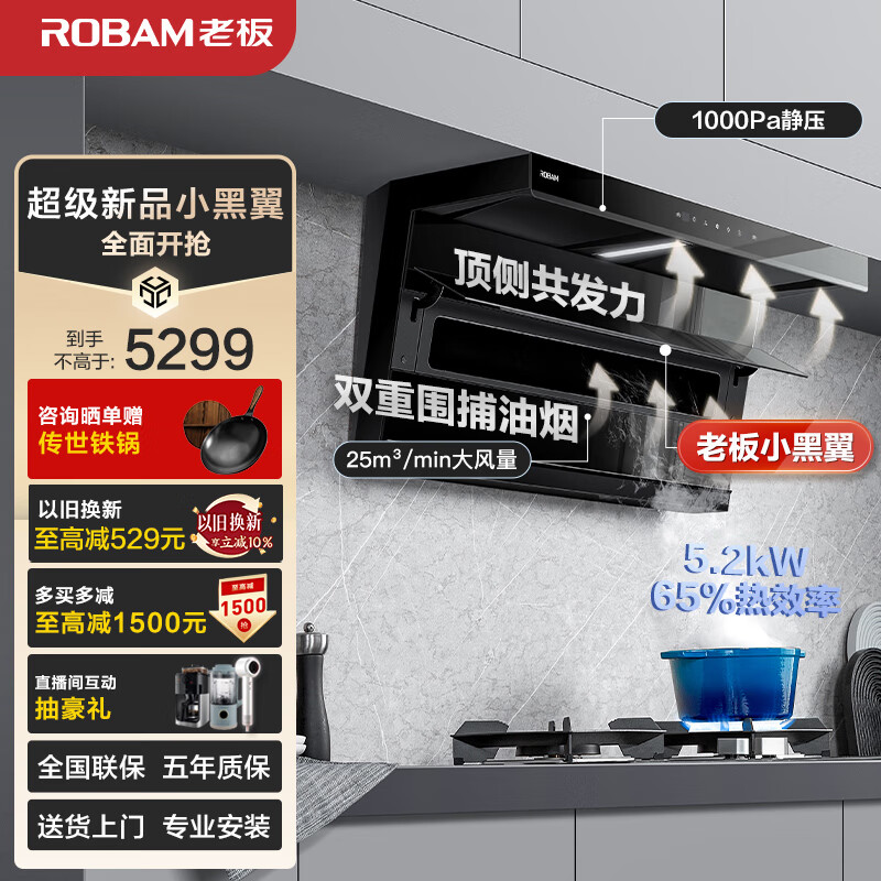 老板(Robam)【小黑翼】油烟机顶侧双吸抽油烟机25立方米7字型吸油烟机燃气灶油烟机27A13-D1烟灶套装价格:5299.00元!