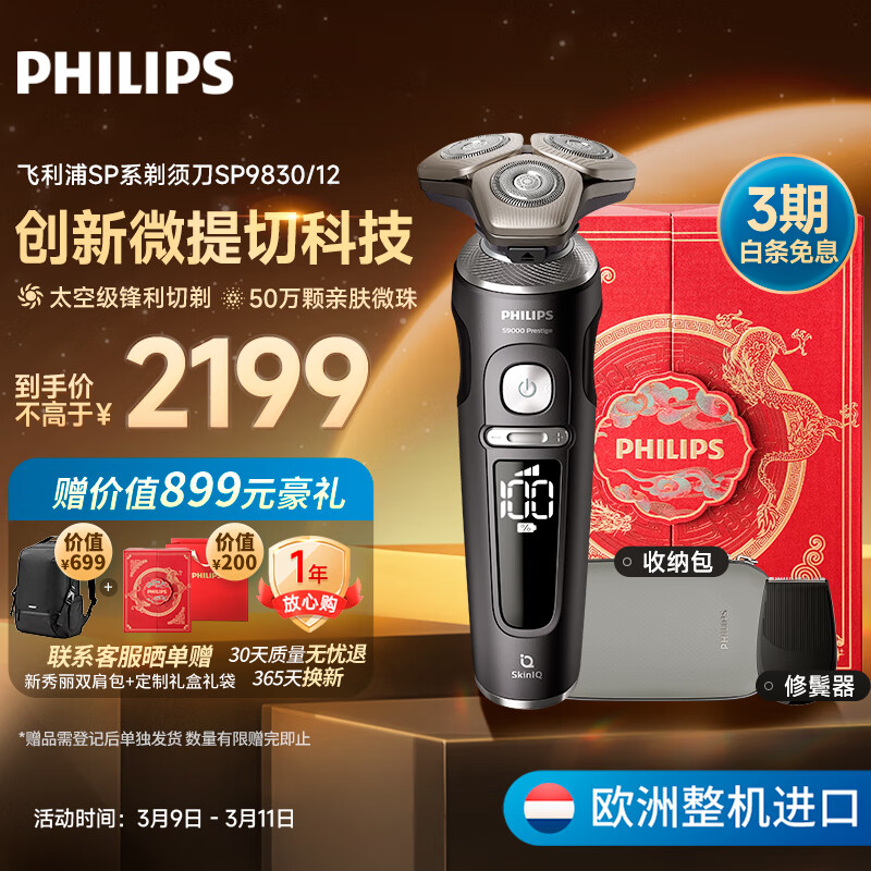 飞利浦(PHILIPS)男士电动剃须刀蜂巢奢享SP9系SkinIQ科技【整机荷兰进口】【生日礼物 龙年定制礼盒送男友老公】价格:2099.00元!