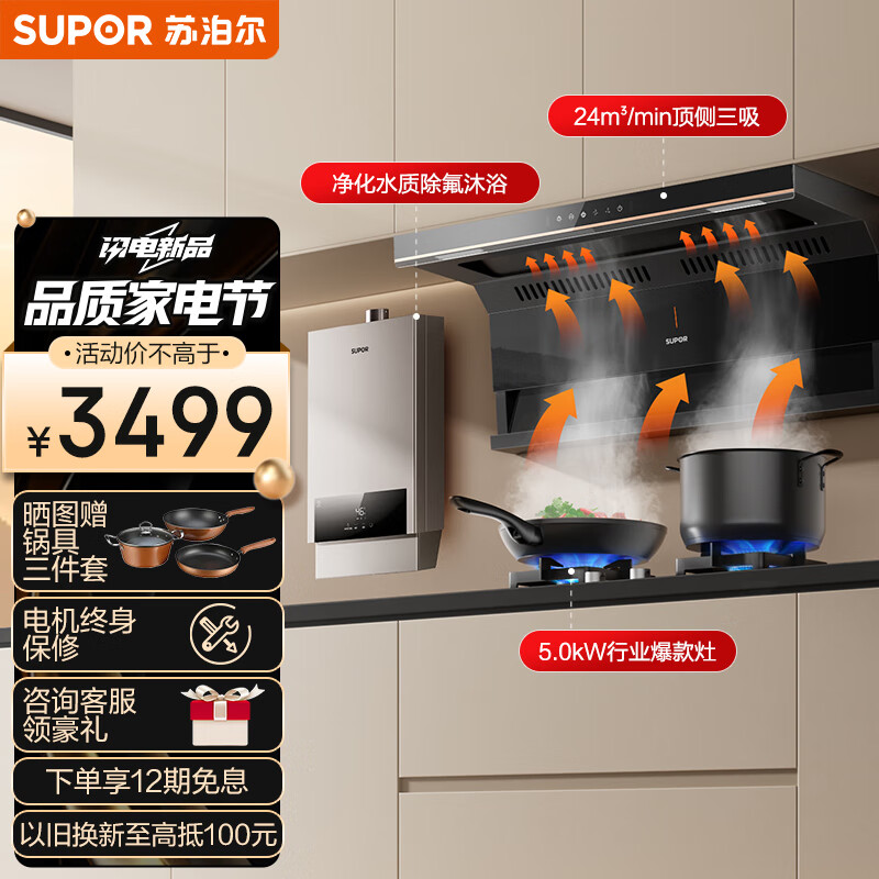 苏泊尔(SUPOR)抽油烟机 双腔拢烟顶侧双吸油烟机套装 24立方吸力变频烟灶热套装 DL35+Q5天然气+DK21S(13R)价格:3499.00元!