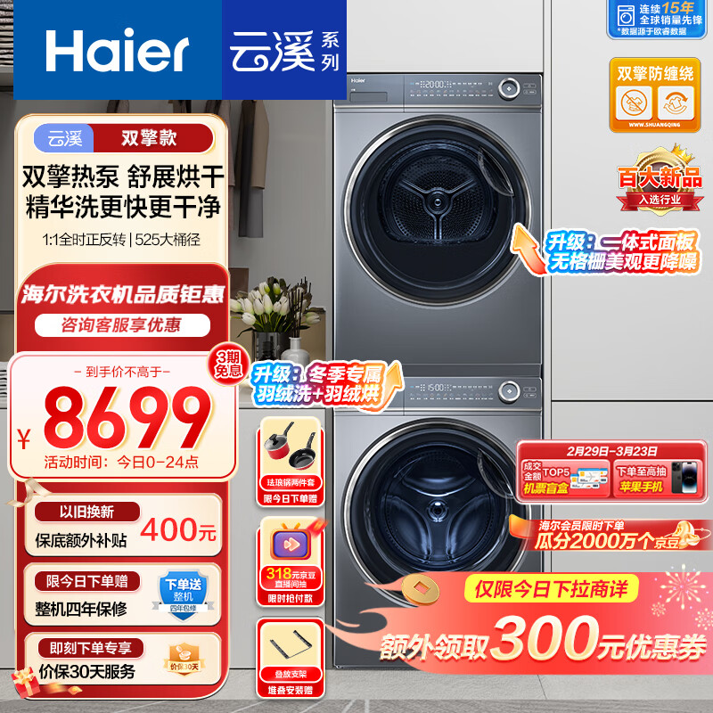 海尔(Haier)云溪376洗烘套装 10Kg精华洗直驱滚筒洗衣机+双擎热泵烘干机 光等离子除菌 BD14376LU1+176XSU1价格:8999.00元!