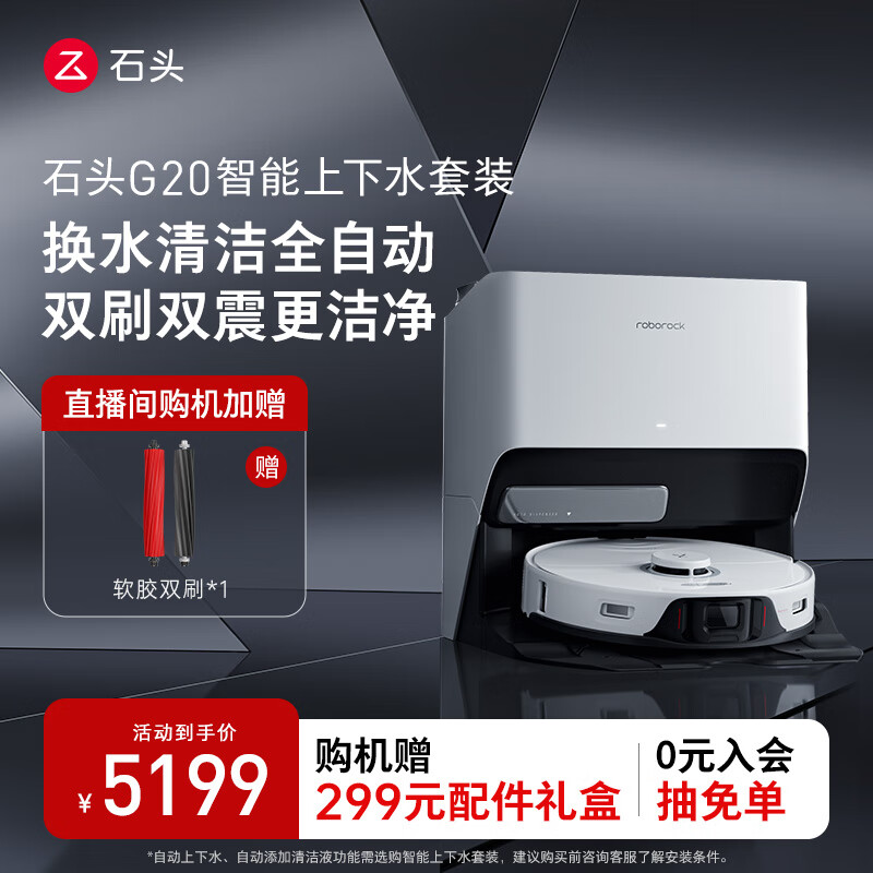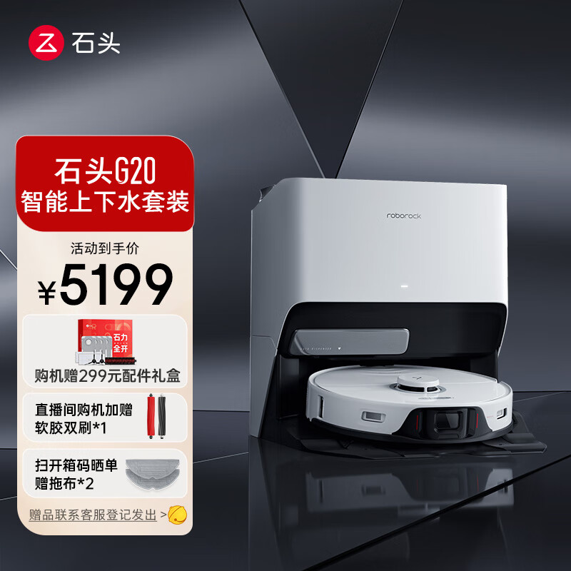 石头(roborock)G20 扫地机器人上下水新升级自动洗拖布自集尘大吸力扫拖一体机 G20智能上下水套装价格:5199.00元!
