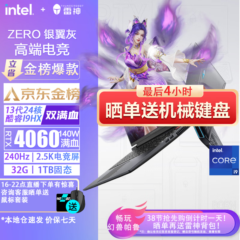 雷神(ThundeRobot) ZERO2024银翼灰/橙独显轻薄全能骨灰玩家级电竞游戏本AI设计师建模移动工作站911旗舰笔记本电脑 i913900HX/4060/32G/1T加配版价格:11399.00元!
