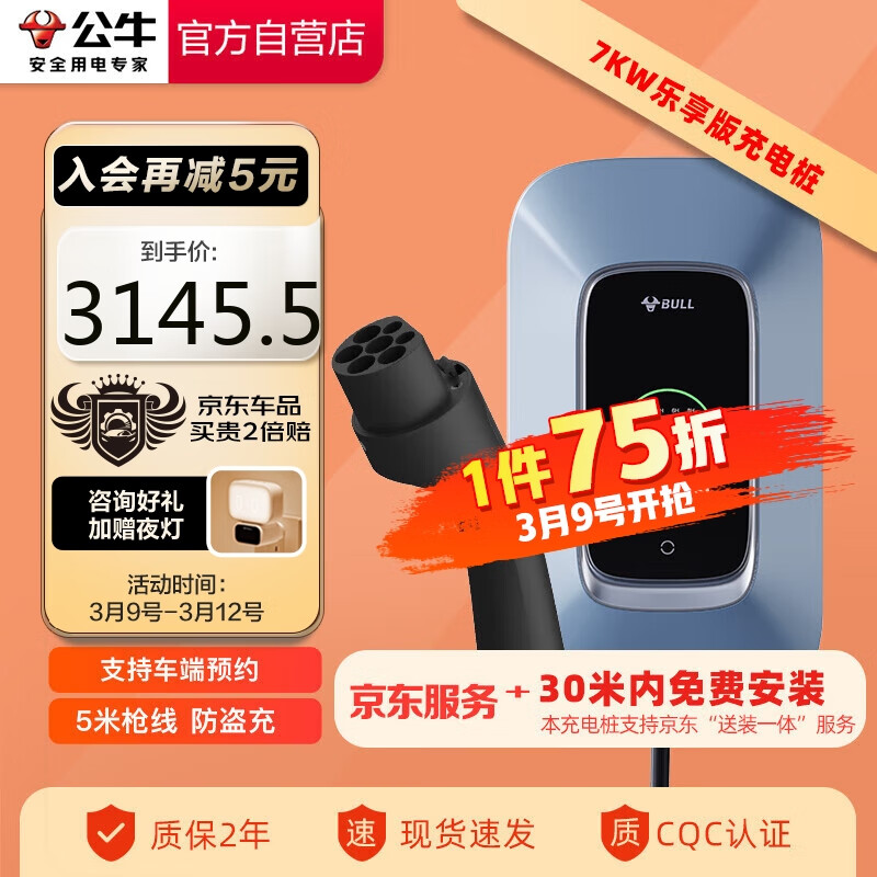 公牛(BULL)新能源汽车交流充电桩动态屏显适用小米su7理想MEGA特斯拉等 7KW乐享款送装一体 30米内免费安装价格:4194.00元!