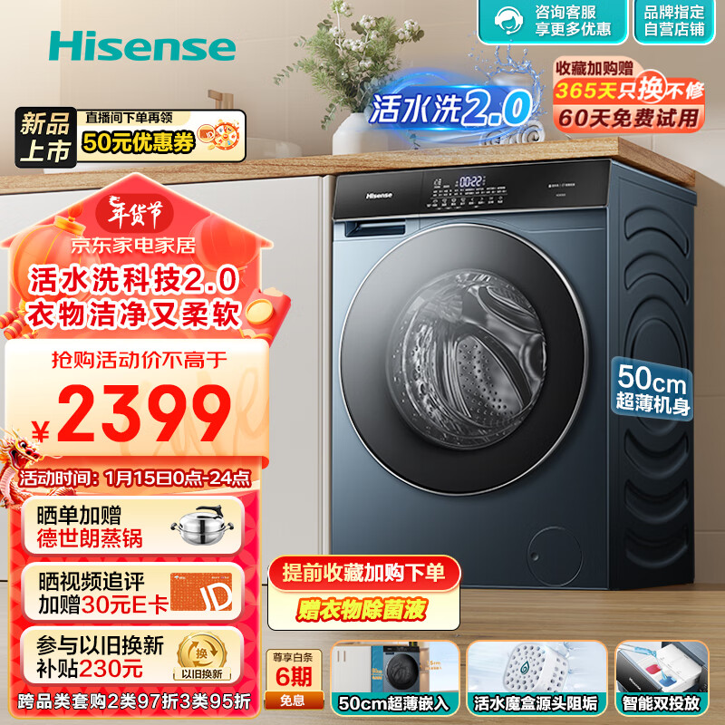 海信(Hisense)滚筒洗衣机全自动 10公斤洗烘一体 超薄智能双投放 活水洗2.0 HD10SE5 以旧换新价格:2399.00元!