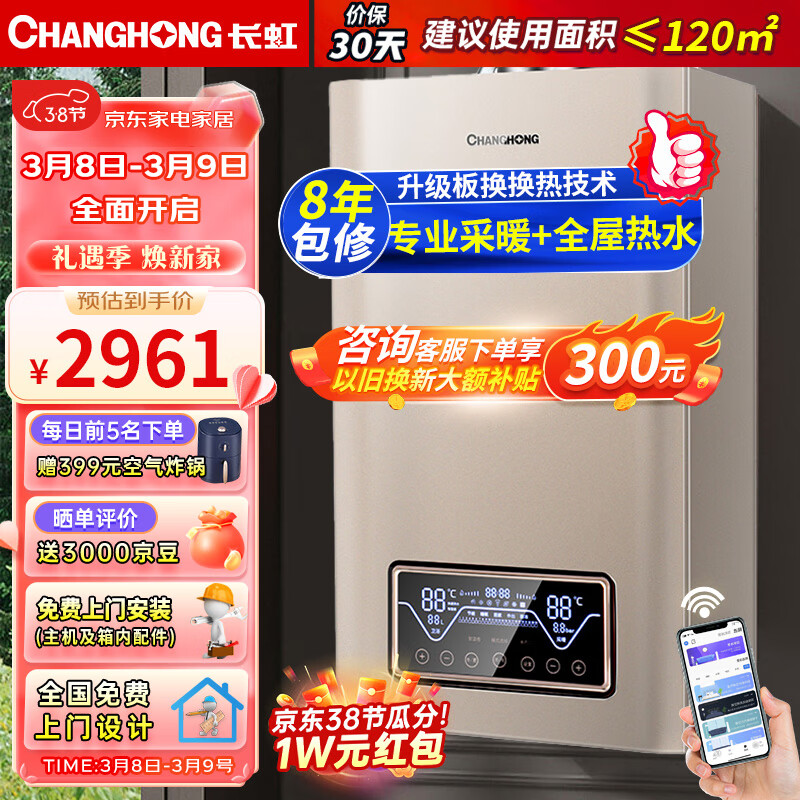 长虹(CHANGHONG)燃气壁挂炉家用供暖淋浴双温双控APP智控多段式燃烧锅炉暖气片地暖恒温L1PB20-BQ01价格:3299.00元!