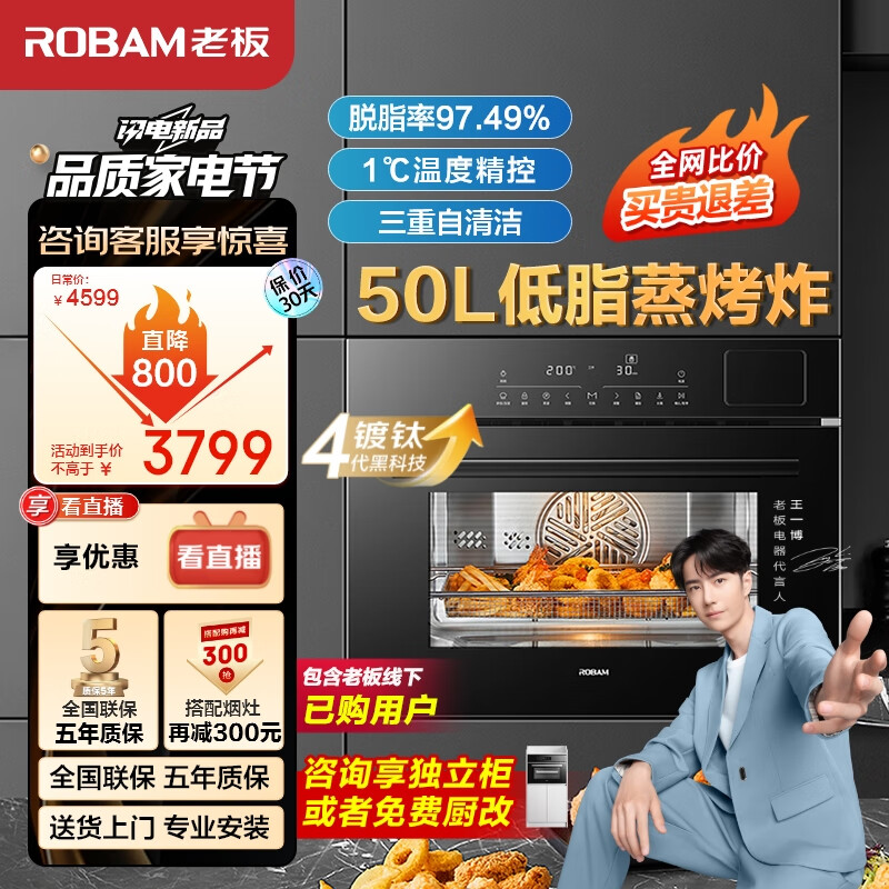老板(Robam)CQ9161D蒸烤箱一体机嵌入式家用多功能50L专业蒸箱烤箱蒸烤炸3合1三重自清洁釉感自净价格:3799.00元!