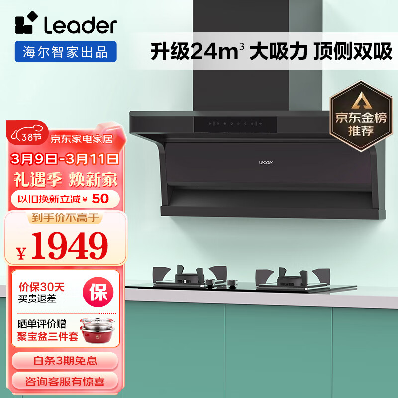 Leader海尔智家出品 顶侧双吸抽油烟机 升级24m3/min大吸力 挥手智控 自清洁烟灶套装IQ92D+QIGL2D价格:1949.00元!