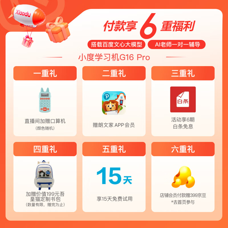 小度学习机G16Pro(6+256GB)小学到高中学生平板电脑 AI家教机 百度文心大模型 护眼 郎文家 家长管控价格:1799.00元!