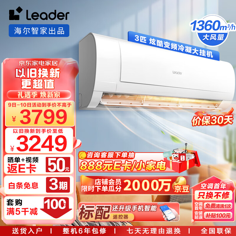 Leader海尔智家出品 3匹新三级客厅变频空调挂式 自清洁空调挂机KFR-72GW/18MDA83TU1价格:3799.00元!