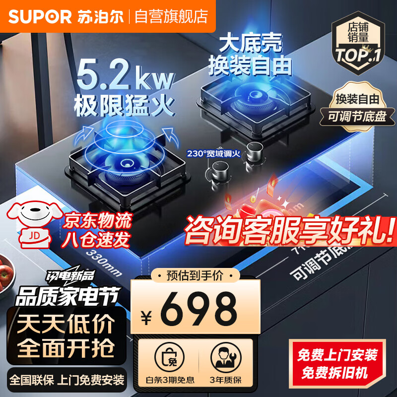 苏泊尔(SUPOR)燃气灶家用天然气灶5.2KW液化气灶双灶台式嵌入式两用家庭灶具63%热效率 230°宽域控火PB15 【管道天然气】5.2KW蓝焰猛火价格:885.00元!
