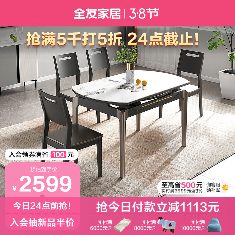 全友家居 餐桌岩板台面功能饭桌方圆可变小户型餐厅折叠款桌子670153价格:3712.86元!