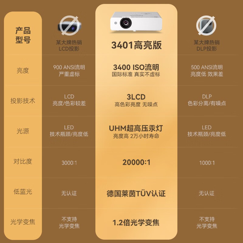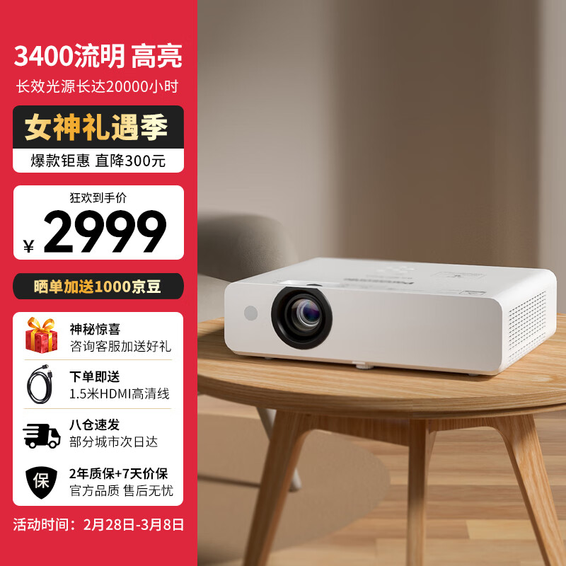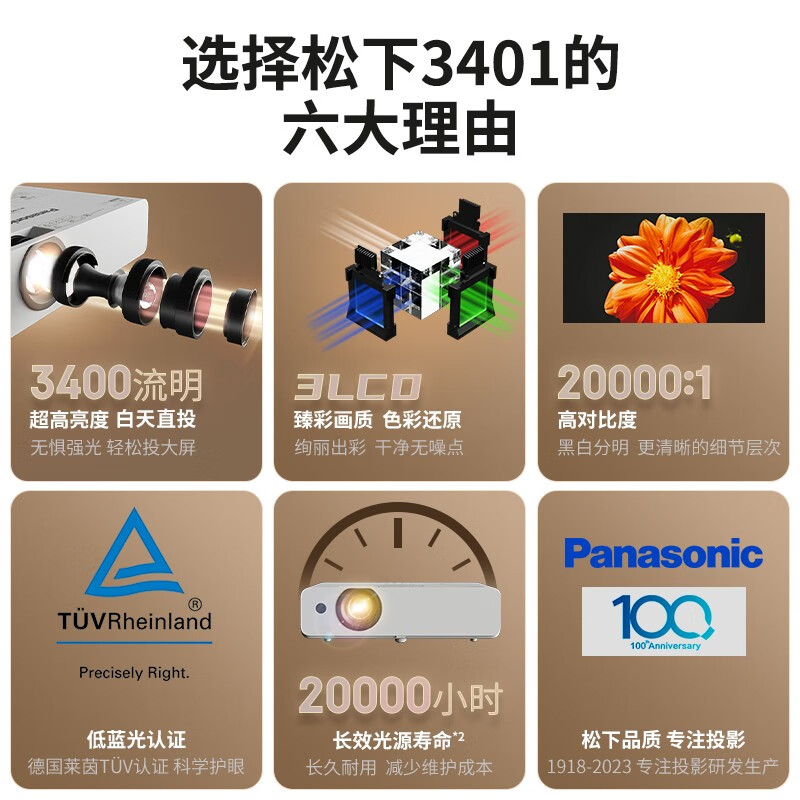 松下(Panasonic)投影仪办公室会议专用 投影机家用商用白天高清教学培训家庭影院 3401高亮版【3400lm办公家用白天直投】 HDMI高清线价格:3299.00元!