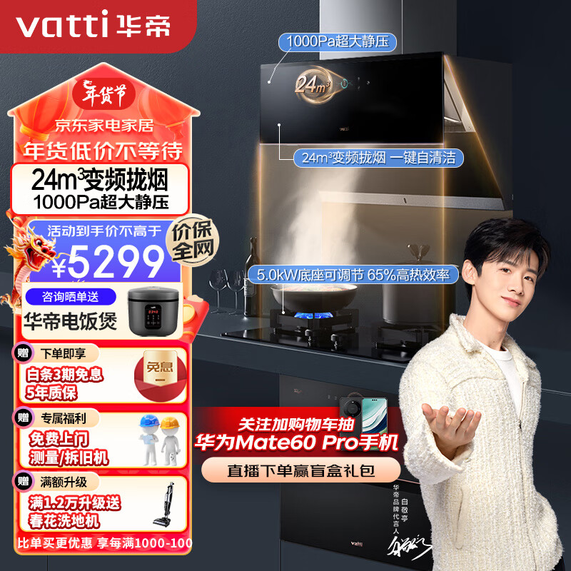 华帝(VATTI)抽油烟机旗舰机王侧吸式变频油烟机燃气灶具消毒柜家用厨房三件套i11193+72B+3036(天然气)价格:5299.00元!