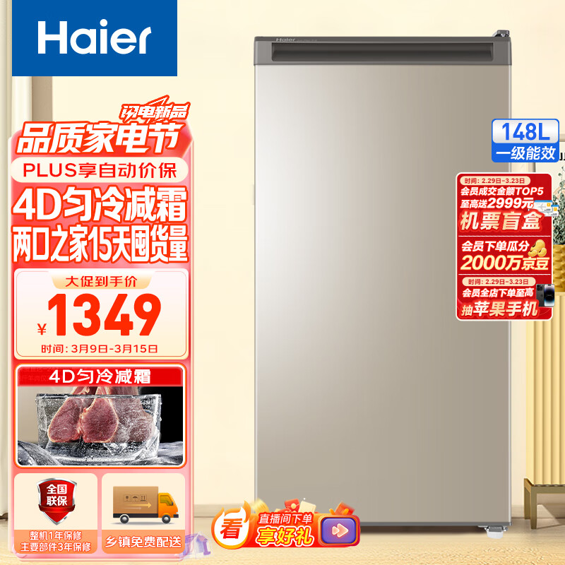 海尔(Haier)148升匀冷家用立式冰柜 母乳冷冻柜抽屉式冷柜囤货小冰柜家用小型冰箱BD-148MDT 以旧换新价格:1349.00元!