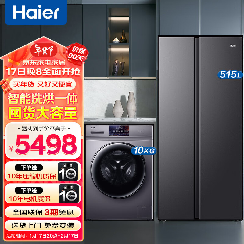 海尔(Haier)冰洗套装 515升一级能效双变频大冷冻超薄对开门冰箱+10KG大容量全自动滚筒洗衣机洗烘一体机价格:5498.00元!