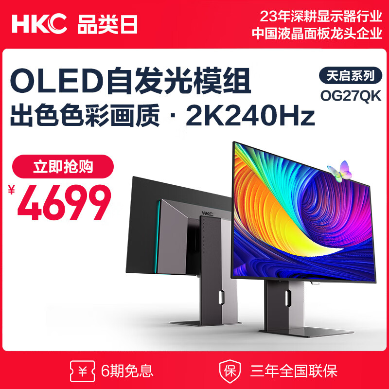 HKC 26.5英寸 OLED 2K 240Hz 0.03ms响应 原生10bit Type-C90W 电竞游戏屏幕旋转升降显示器 OG27QK价格:5199.00元!