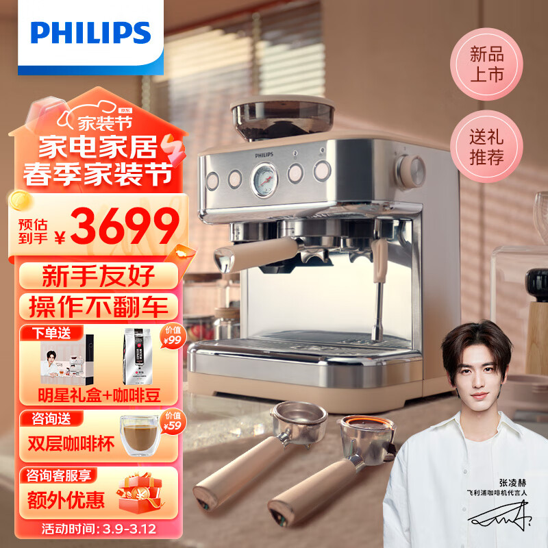 飞利浦(PHILIPS)双子星系列张凌赫推荐意式家用胶囊半自动咖啡机双手柄设计专业萃取奶泡研磨一体PSA2218/50价格:3699.00元!