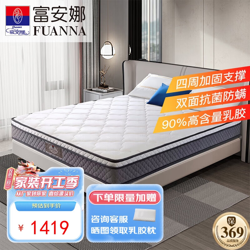 富安娜床垫 软硬适中整网弹簧抗菌防螨泰国进口乳胶床垫子 1.5*2米 云享价格:1659.00元!