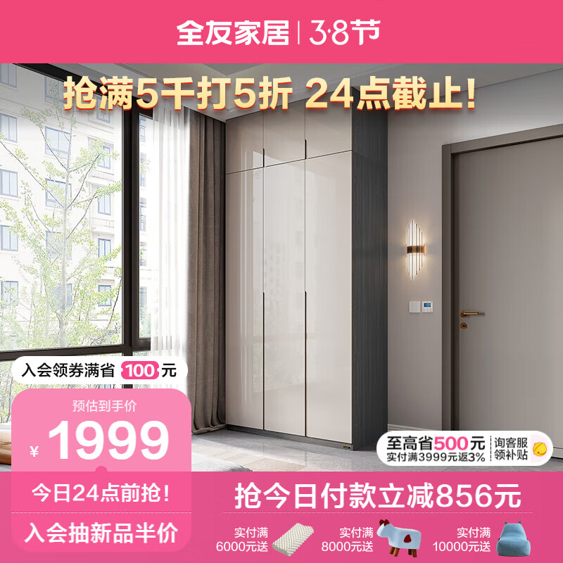 全友家居 衣柜卧室极简风模块化收纳智能感应灯平开门储物柜子DG10010价格:2855.71元!