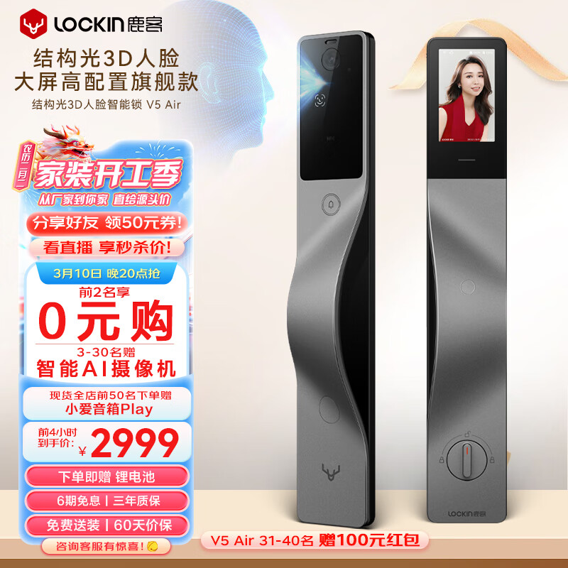 鹿客(lockin)V5 Air结构光人脸识别猫眼大屏智能密码锁APP智联适用左开门价格:3699.00元!