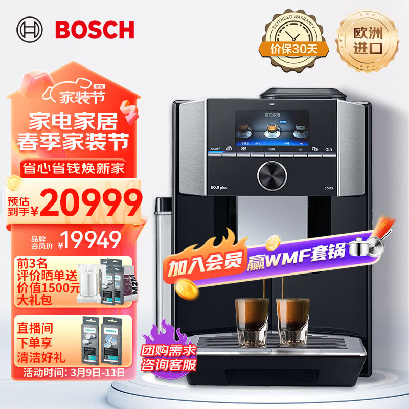 西门子【个性化定制】全自动咖啡机意式研磨一体机咖啡师模式欧洲进口智能联网EQ9 TI955809CN价格:19949.00元!