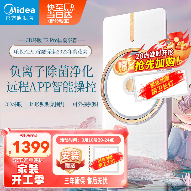 美的(Midea)风暖浴霸暖风照明排气一体集成吊顶卫生间吹风环形双核智能F2Pro价格:1399.00元!