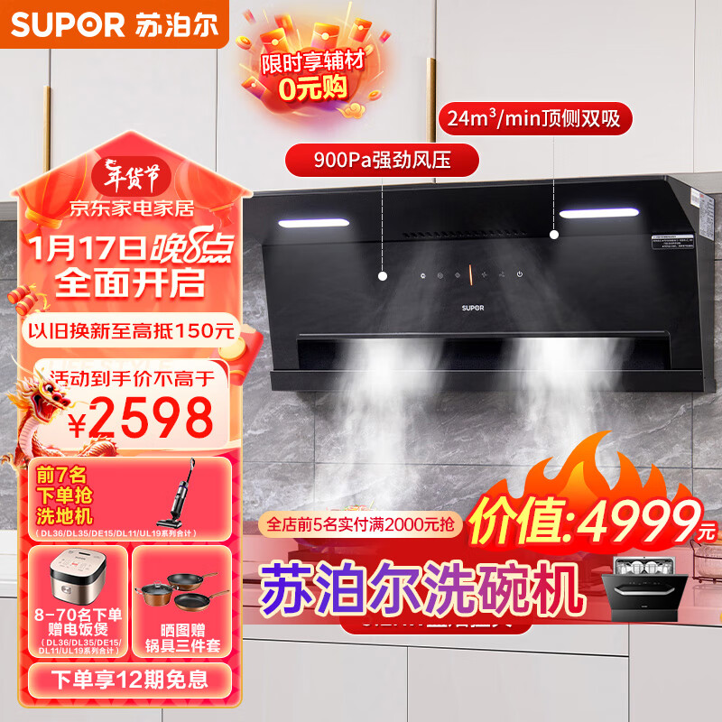 苏泊尔(SUPOR)抽油烟机 顶侧双吸油烟机灶具套装 24立方大吸力烟灶套装 家用油烟机燃气灶套装 DL36+DB28天然气价格:2898.00元!