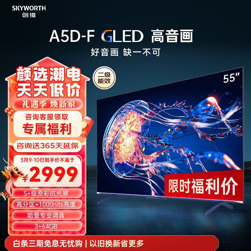 创维电视55A5D-F 55英寸 4K超高清 硬件多分区 3+64GB 哈曼调音 远场语音 彩电液晶超薄护眼平板电视机价格:2999.00元!