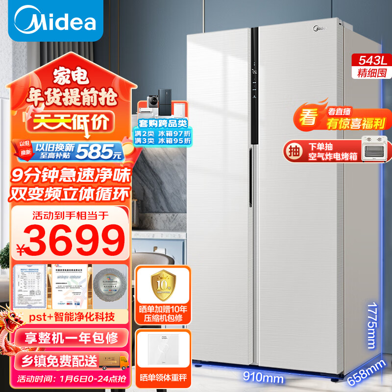 美的(Midea)9分钟急速净味543升对开门双开门白色家用电冰箱一级能效变频超薄大容量BCD-543WKPZM(E)京东小家价格:3999.00元!