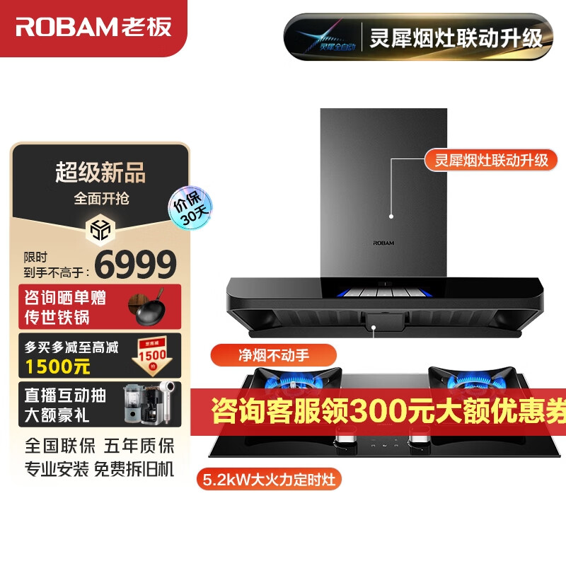 老板(Robam)【灵犀烟灶联动升级】抽油烟机双腔25立方米定时防干烧燃气灶吸油烟机套装63A3S+51B0A天然气价格:6999.00元!