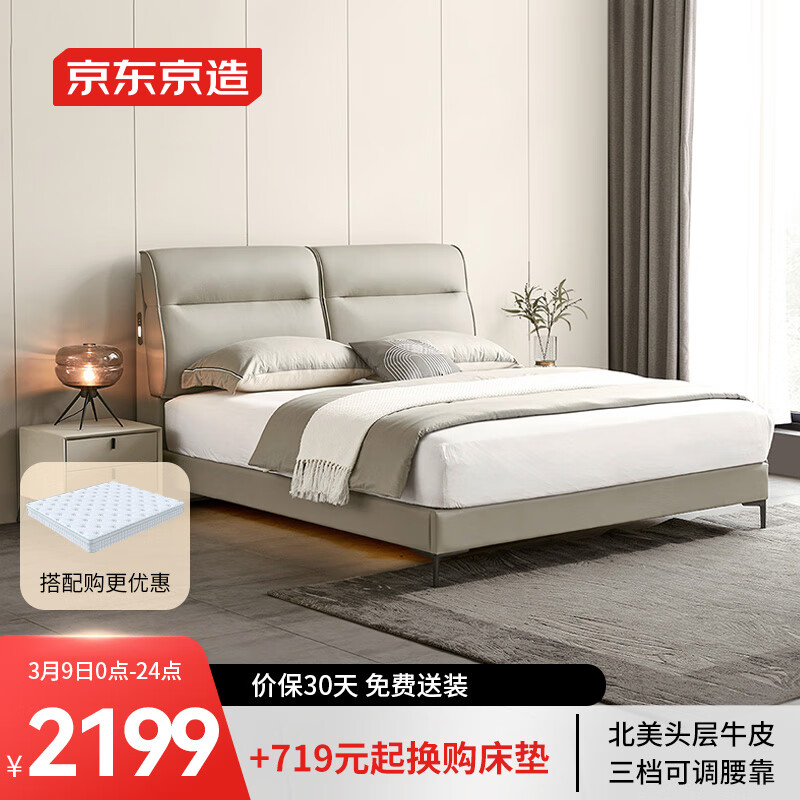 京东京造真皮床 进口牛皮|三档靠背|实木排骨架 主卧双人床1.5米×2米BL02价格:2399.00元!