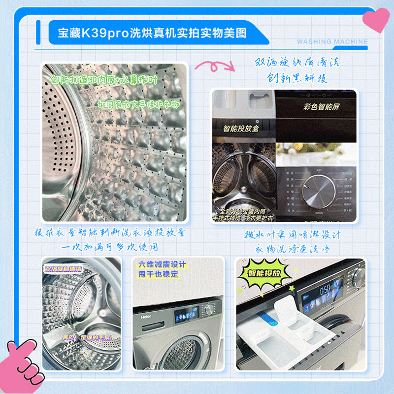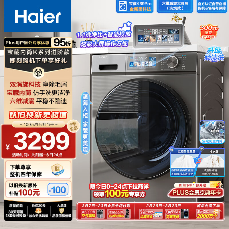 海尔(Haier)滚筒洗衣机全自动 洗烘一体机 宝藏K39Pro 10公斤大容量 超薄智投 双涡旋除毛 六维减震 EG100H65S价格:3399.00元!